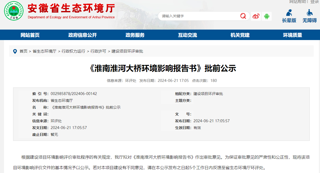 近日,安徽省生态环境厅官网公布《淮南淮河大桥环境影响报告书》批前公示,征求意见。