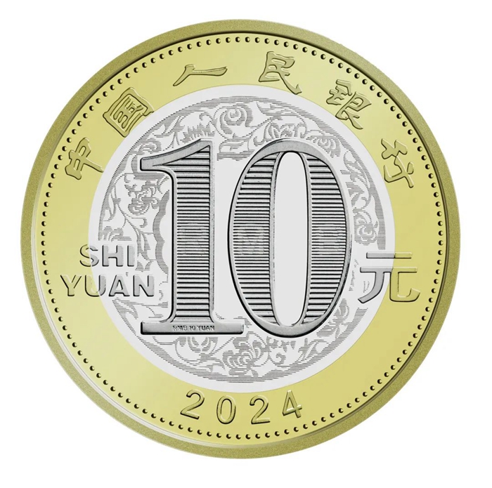 双色铜合金留念币正面图画为“我国人民银行”、“10元”字样,汉语拼音字母“SHIYUAN”及年号“2024”,底纹衬以团花图画。