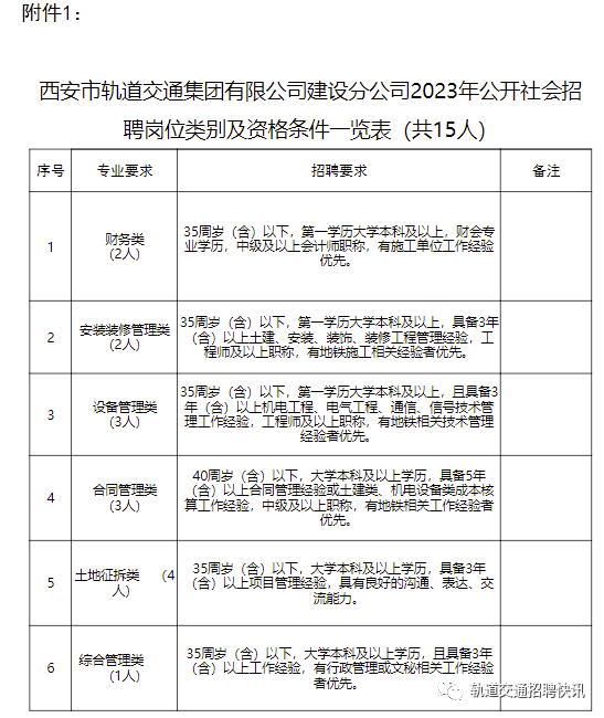 本次揭露招聘岗位类别6类,方案招聘人员合计15人,详细岗位类别及任职要求详见附件一《西安市轨迹交通集团有限公司建造分公司2023年揭露社会招聘岗位类别及资历条件一览表》。