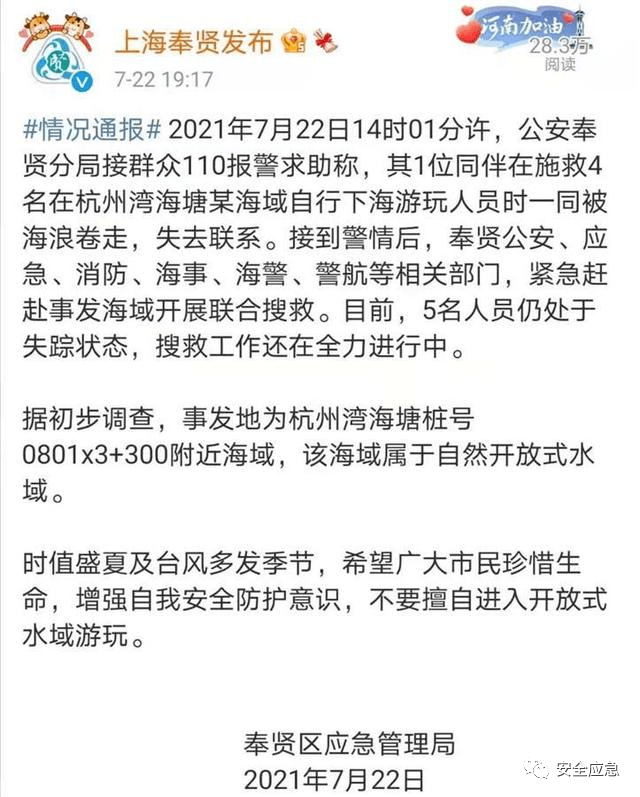 据上海市奉贤区应急办理局音讯,2021年7月22日14时01分许,上海公安奉贤分局接大众110报警求助称,其1位伙伴在施救4名在杭州湾海塘某海域自行下海玩耍人员时一同被波浪卷走,失掉联络。