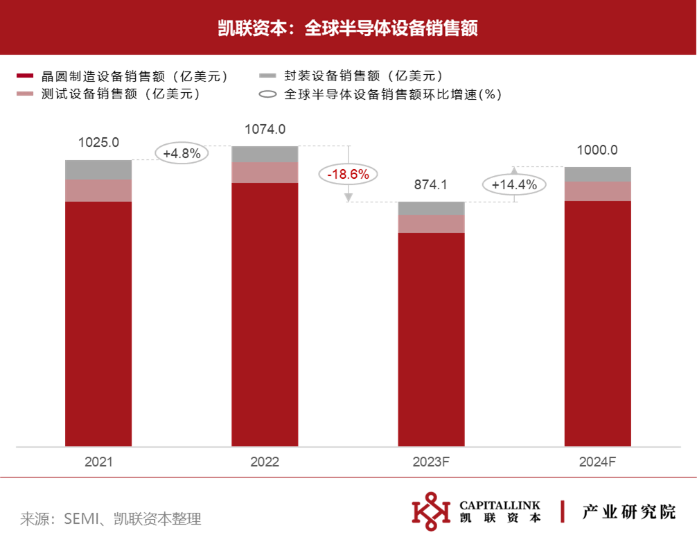 设备端:据SEMI数据,受到宏观经济影响及下游需求疲软,晶圆厂产能利用率下滑,资本投入谨慎,预计2023年全球半导体设备销售额将从2022年的1074亿美元减少18.6%,至874亿美元。2024年将复苏至1000亿美元。