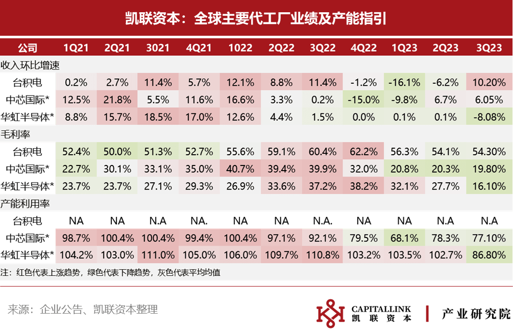 SEMI数据显示,2023年Q3全球IDM和晶圆代工的产能利用率滑落到80%以下,预计第四季度见底。