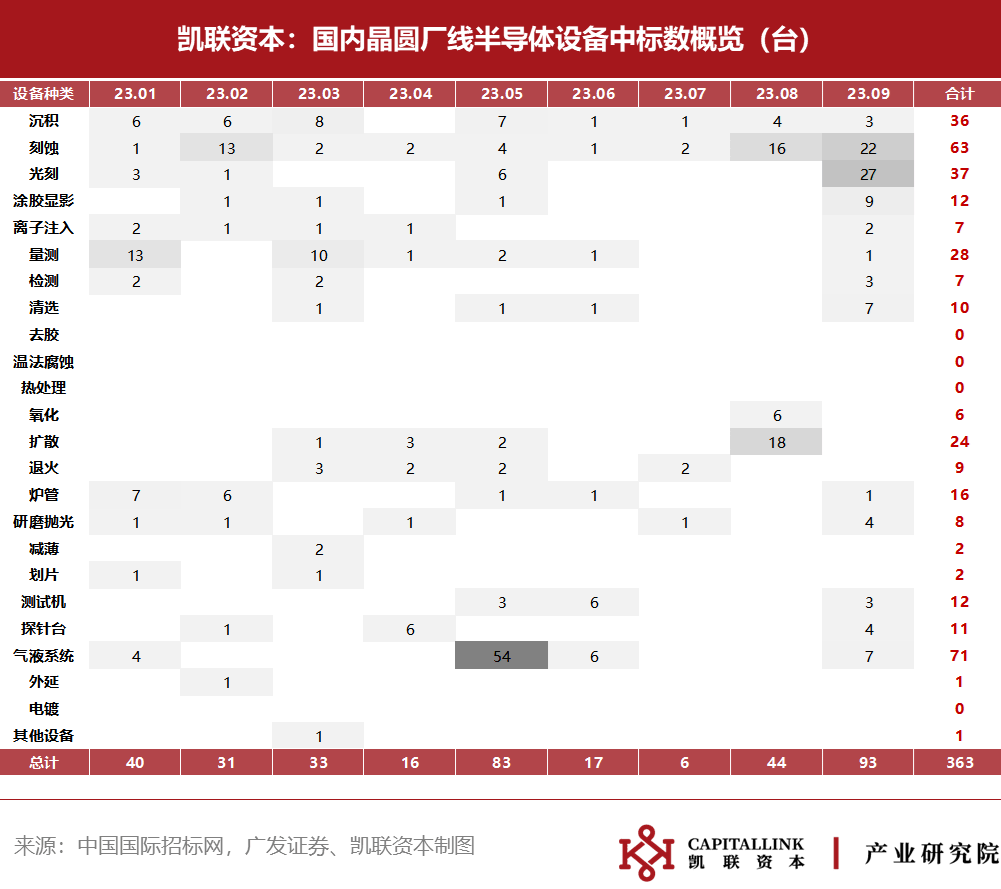 与之相反,中国半导体设备销售情况逆势增长,根据可统计国内晶圆厂样本显示,2023Q3国内晶圆厂线%,结合招标及中标数据来看,Q3设备采购需求显著增长,尤其集中于光刻、刻蚀等高端设备。主要原因主要在于,荷兰政府原定9月1日正式生效对华芯片制造设备的出口管制措施,后ASML通过特许申请,宽限其出口许可至2023年底,因此国内晶圆厂或有计划的储备采购部分先进浸润式 DUV 光刻机,以应对日荷日趋严格的设备出口禁令。自2024年1月1日起,ASML将没有办法获得向中国客户发运这些设备的出口许可证。
