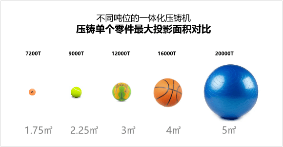 哪吒汽车研发的超20000吨压铸机是目前市面上能力最强的压铸单元,能够一次性生产5㎡的压铸零件。压铸机的能力最主要是根据压铸机在特定压铸压力下可生产的零件的投影面积,也就是决定了压铸零件的尺寸。比如在40MPa的压铸压力下,7200T的投影面积能够达到1.75㎡ ,9000T的投影面积能够达到2.25㎡,12000T的投影面积能够达到3㎡,16000T的投影面积能够达到4㎡,20000T的投影面积能够达到5㎡。